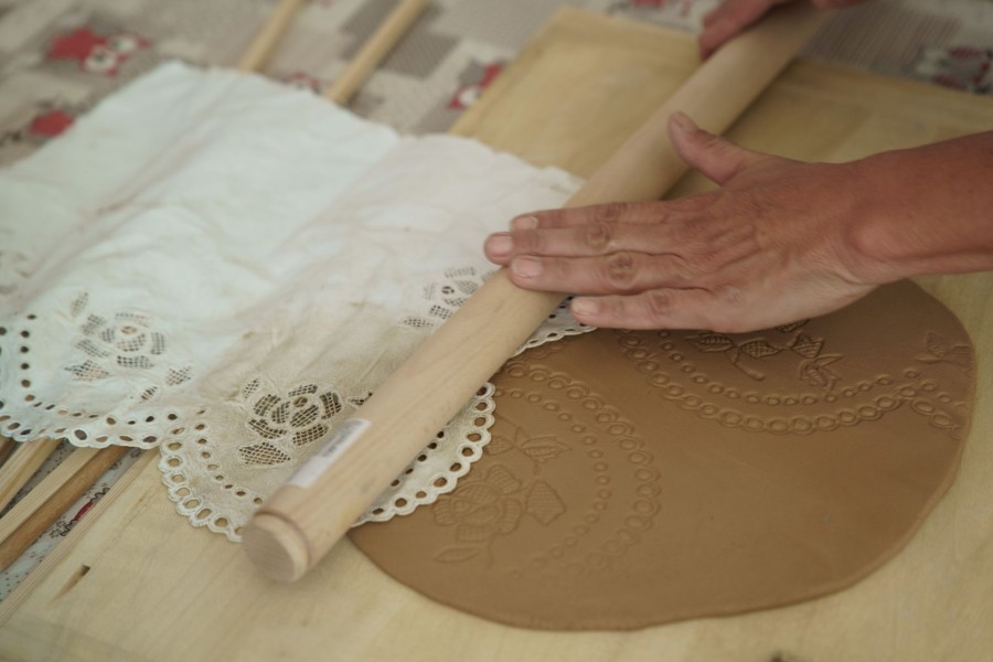Amíg száradtak a fedők, mindenki korongon elkészítette az edényt. Az edényeknek kellett egy kis idő a száradáshoz, hogy a díszítő motívumokat könnyebb legyen felvinni a felületre. Ezt követően a fülprés segítségével elkészültek az edény fülei. A félig száradt edényekre ráhelyezték a füleket, majd elkezdődhetett az engobbal való díszítés íróka segítségével.