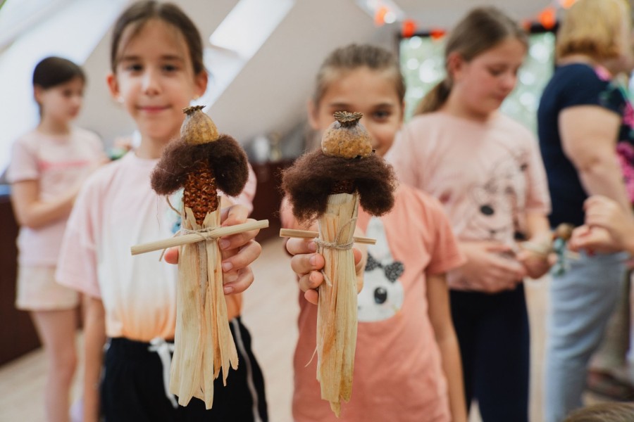 Ezt követően a lányokkal elkészítették a kukoricacsutka babát. A kukoricacsuhé levélből szoknyát kötöttek, gyékényből kezet készítettek, színes gyapjúból hajat ragasztottak és végül mákgubóból készült kalapot raktak a baba fejére.